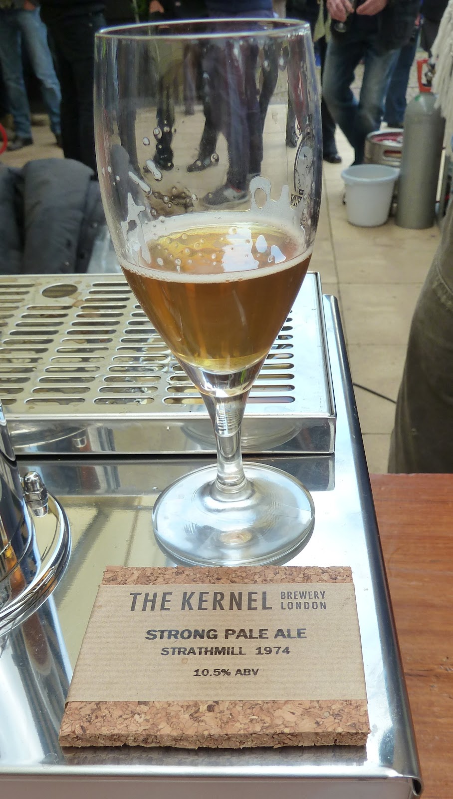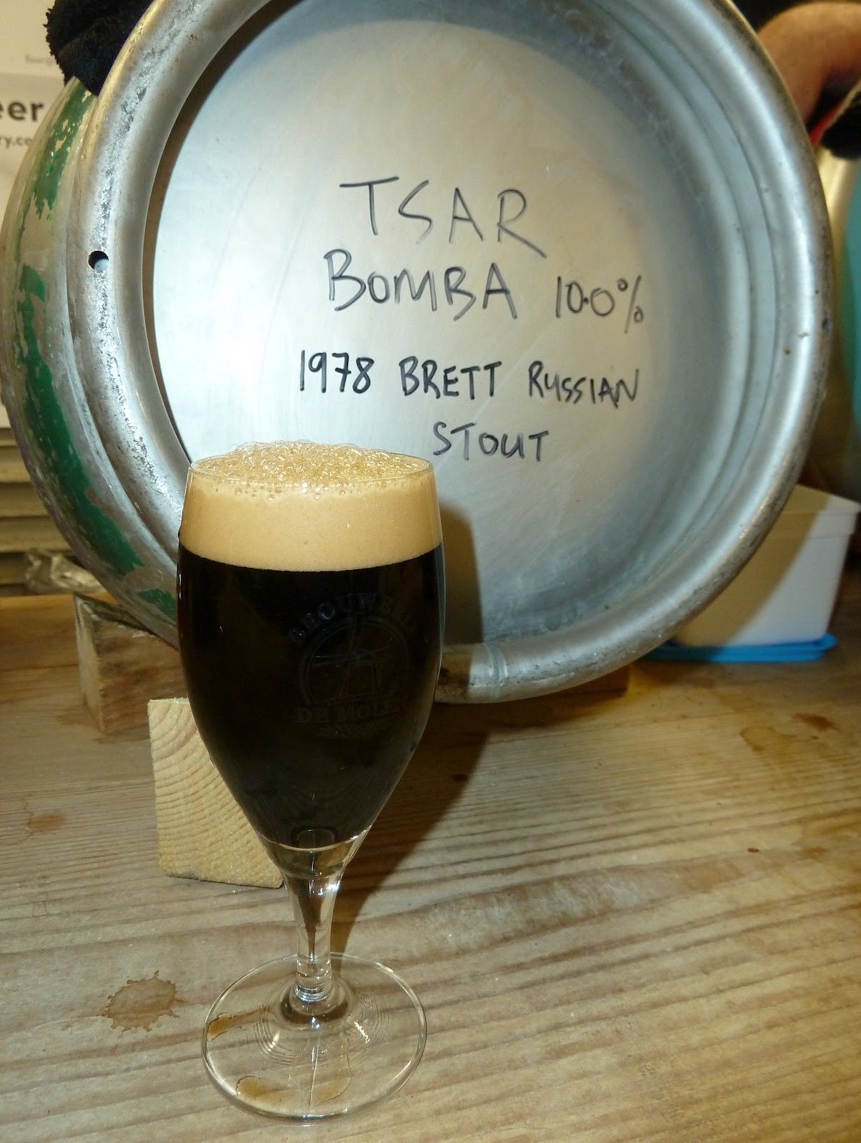Tsar Bomba, a 10% ABV imperial stout. Its origins lie in a bottle of 1978 Courage Imperial Russian Stout, sent to the lab for analysis which showed that the only thing still living in it was Courage's hungry and deathless strain of Brettanomyces. Buxton cultured it up and fermented Tsar Bomba with it. My first thought on tasting it was "Oh, Orval has made a stout." The Brett funk is right up at the front but it's not overpowering: there's enough chocolate smoothness to hold it in check, providing a residual dark sweetness that not even this beast of a yeast could chomp through. And just on the end that assertive tang of hops. A strange and challenging beer, but in a quite delicious way.