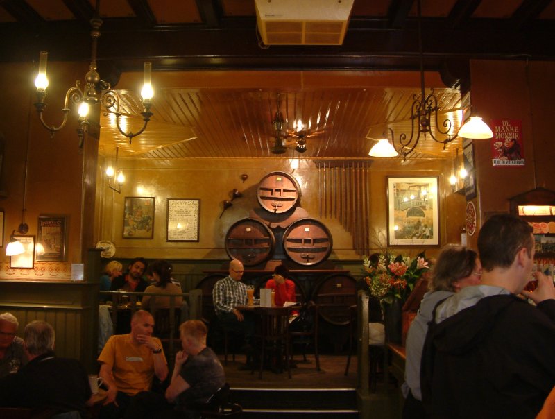 As we walked through the onion-skin city, the 17th century core gave way to 19th century splendour by the zoo and the neighbourhood was altogether more modern by the time the windmill was in sight. I had heard that the pub, too, had undergone a transformation in recent years and sure enough it has almost doubled in size, turning an L-shape with a new 18-tap bar running the whole way along. And yet they've still managed to retain a lot of the old poky character. It still has a watering-hole feel and the locals are still drinking in it, though they're now outnumbered by the backpackers and international students. Opening time has moved a whole hour forward to accommodate the newcomers, and the doors were unlocked at 2pm. Closing remains a strict, civilised, 8pm. So still very much my kind of place.