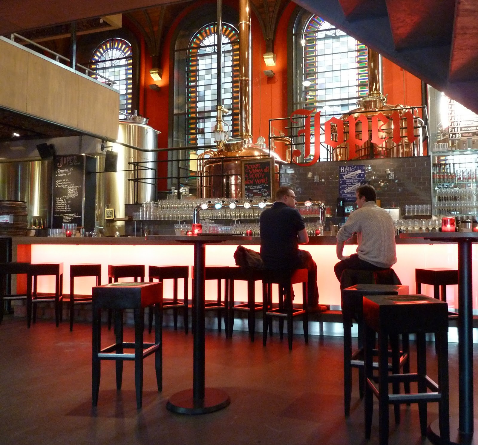 Top of my agenda for this quick excursion to the Netherlands was a trip out of the city to Haarlem, and a visit to the Jopenkerk. Jopen is a fairly big, well established, Dutch brewery but the range and quality of their beer is impressive. Information on where the main brewing happens is hard come by, but the Jopenkerk is their brewing showroom: a roomy brewpub in a converted church set up more to help show the process to the punters than as a serious production facility.