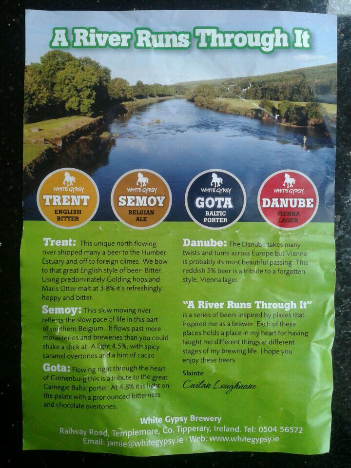 The other brewery that really pushed the boat out (wait, wait: you'll see what I did there) as regards festival specials was White Gypsy. They had a genre-spanning set of four grouped under the heading "A River Runs Through It", each named for a waterway (Aha! See?) appropriate to the style. They even printed an explanatory leaflet. There was a Belgian blonde ale called Semoy: just 4.5% ABV but tasting like much more, with huge heavy banana esters up front and enough carbonation to balance it with a dry carbonic quality. Some light white pepper and hop-induced celery seasons it, and the whole is set on a lightly chalky mineral base. A lot going on considering its modest strength. I left it late to try the Danube Vienna lager, though Aoife told me it was the biggest seller at the bar. It's the appropriate shade of red amber but a little too sweet for my liking: I'd have liked more of a lagery cleanness and maybe a smidge more hopping.