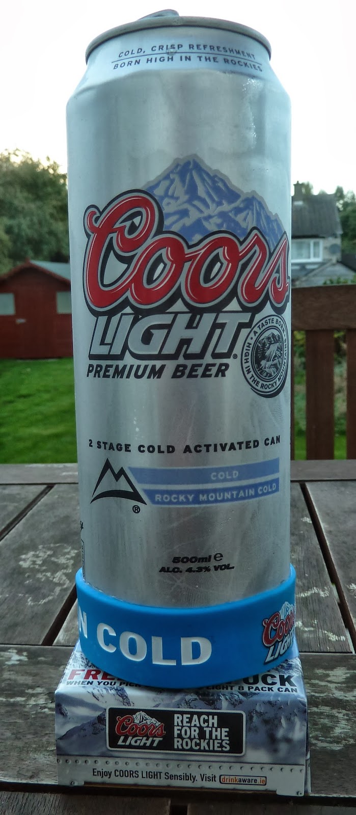 That's all the e-mail said, but I could see it came from the company which does PR for Heineken Ireland. I like surprises so I gave them my address without asking further questions. A couple of hours later a parcel arrived containing eight half-litre cans of Coors Light. My lucky day. Less than a month out of the brewery, too. It wasn't just a random gift, however: they were promoting a gewgaw which comes free with sufficient purchase of the beer. This affixes to the bottom of the can, keeping it extra-cold while it's being consumed. From, presumably, the can itself. Swish.
