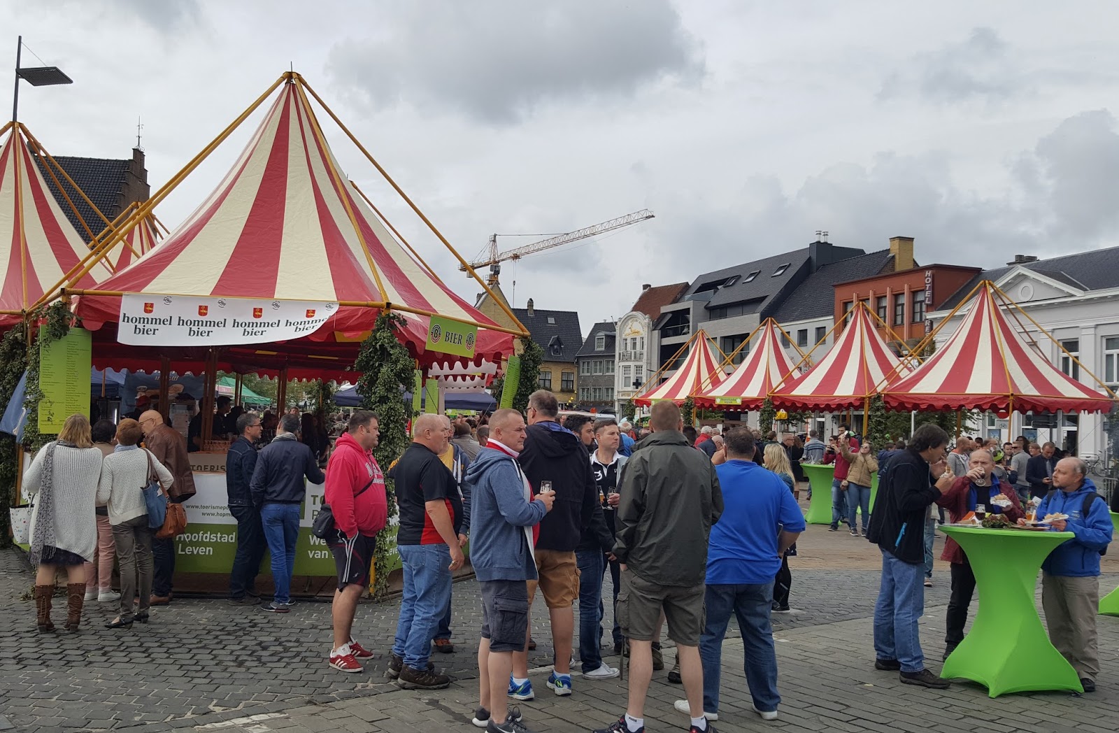 My beer bucket list, is, was, a short one. Bamberg came off it in 2014; Portland last year; and the Toer de Gueze back in May. The only other item is one that had been on the list since the very beginning, so long that I regularly forgot about it for long spells, though never quite lost interest in it completely. The Poperinge Hop Festival happens once every three years, in the heart of the West Flanders hop-growing region. It's a celebration of the harvest on which the area's fortune was traditionally made and which, judging from the fields surrounding the town, is still part of the economy. The 2014 iteration was covered excellently on Belgian Smaak in this post, and it seems that the festival doesn't change; everything was pretty much the same when I arrived for 2017's outing.