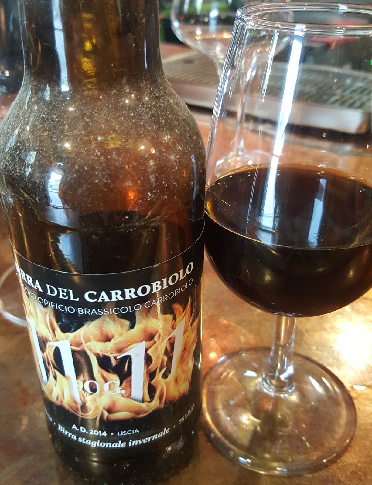 And finally OG 1111, of which our host seemed to have a particular personal affinity. It's named after the original gravity and is a peated strong ale, coming out at 13% ABV. We got to taste the 2014 vintage which was flat, viscous and earthy, mixing funk and smoke with a beefy autolytic quality. There's a lot of going on, but I think slightly too much of it was what generally get called off-flavours. Any attractive complexity is offset by tastes that are just not quite right, in any beer. I'd chalk it up as a draw: it's fine, but probably better when not aged.That concludes the day's Carrobiolo beers, but we don't get to escape just yet...