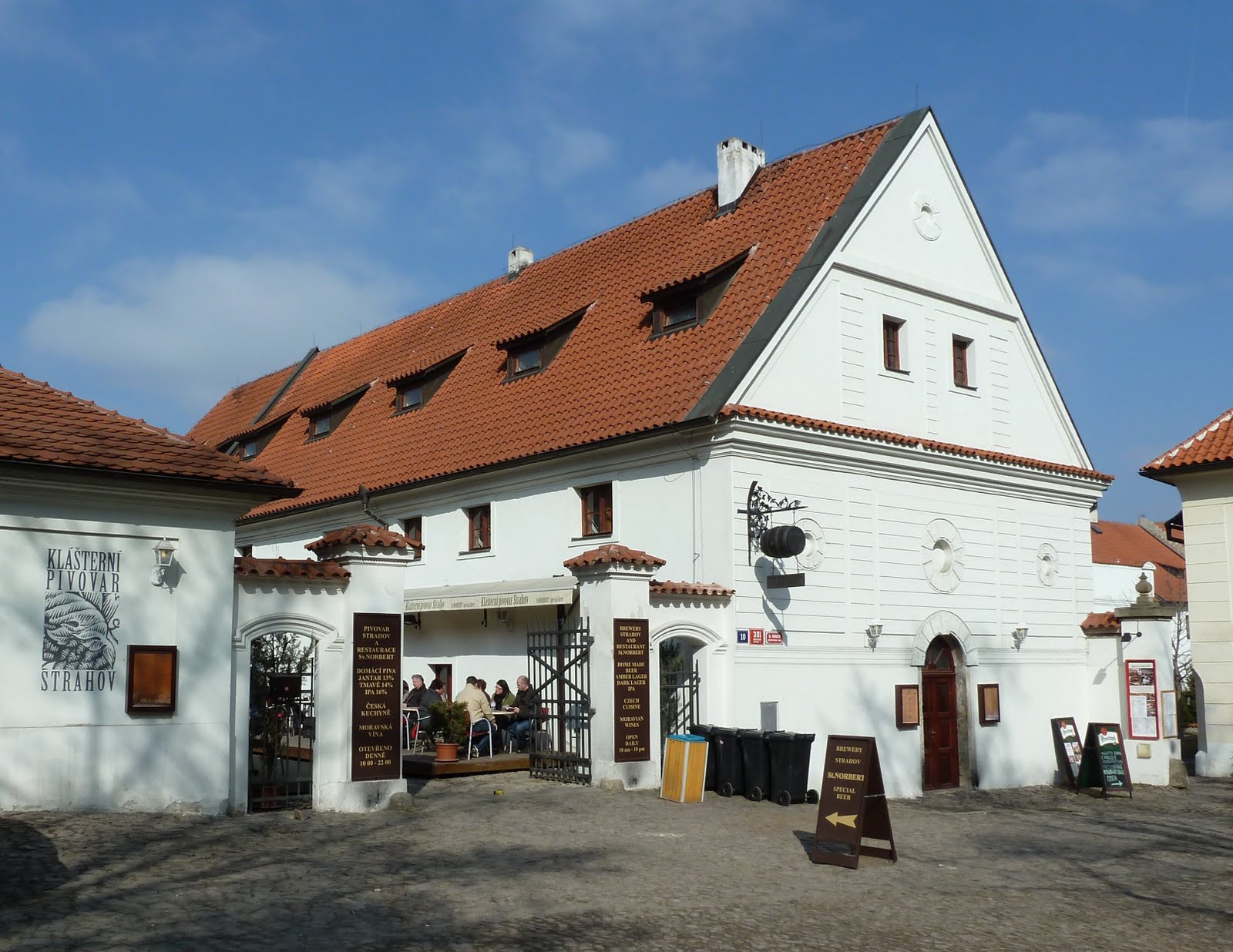 On the western bank of the Vltava, above even the castle and cathedral and tucked away behind a nondescript streetfront, sits the Norbertine Strahov monastery. It's still very much in the god-bothering business (the order's founder is buried on-site), but presumably on a much smaller scale than hitherto as parts of the complex have been repurposed for other things: there's accommodation, a restaurant and, in one quarter of the courtyard, a brewpub. The indoor barroom is small, with just five tables, encouraging punters to make use of the large and sunny terrace outside.Three beers are produced all year round, plus one of six seasonals. For March it was Masopustní (picture, right), the Lenten beer.