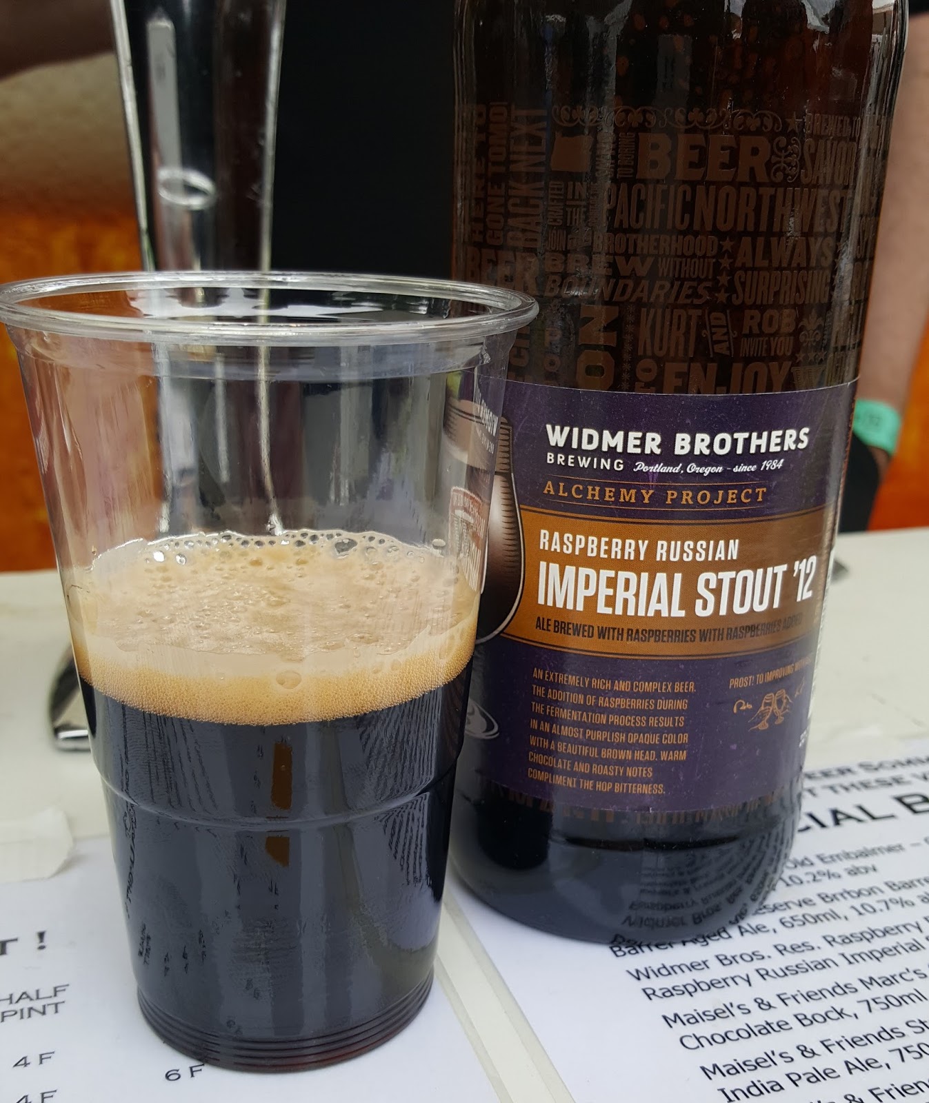 The remains of the afternoon played out at the Premier International Beer Heaven stand, a fixture of Taste quite possibly since year one. From a distance I had been wondering which new American brewery was responsible for the distinctive paddle-like tap handles but closer inspection revealed it to be Bavaria's own Maisel, going full yank with its craftish range. Among them: Maisel Pale Ale, simple and fun with the clean bitterness of a real American pale ale but wearing more of a German costume up front in the form of a green celery hop bite; Maisel India Ale raises the ABV from 5.2% to 6.3% but hits pretty much the same flavour points, except more of them. The strength is well hidden, however. And best of the lot was Maisel Choco Porter, a lovely balancing act of sweet milky chocolate and dry roasted malt, rich and full while staying clean and drinkable, and all done without the addition of any non-Reinheitsgebot additives. Impressive, but also lovely to just knock back. Except it's 6.5% ABV.And because we weren't wobbly enough already, Dean broke out the good stuff before we left, starting with a bomber of Widmer Brothers Brrrbon '12. This 9.4%-er is a mucky orange colour and smells of vanilla and lime, meaning the brewery definitely got its money's worth out of that bourbon barrel. It's smooth at first but a growing sweetness makes it more and more difficult to drink as it goes along. I found myself struggling desperately to appreciate its intensity before realising that I just actually don't like it.